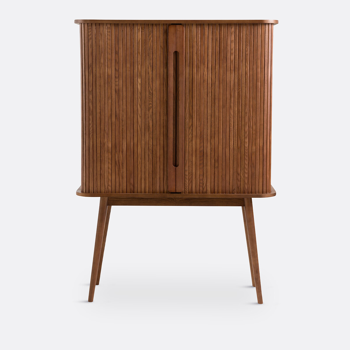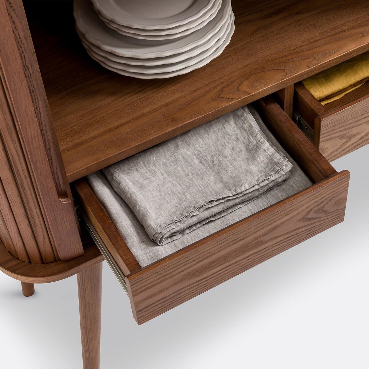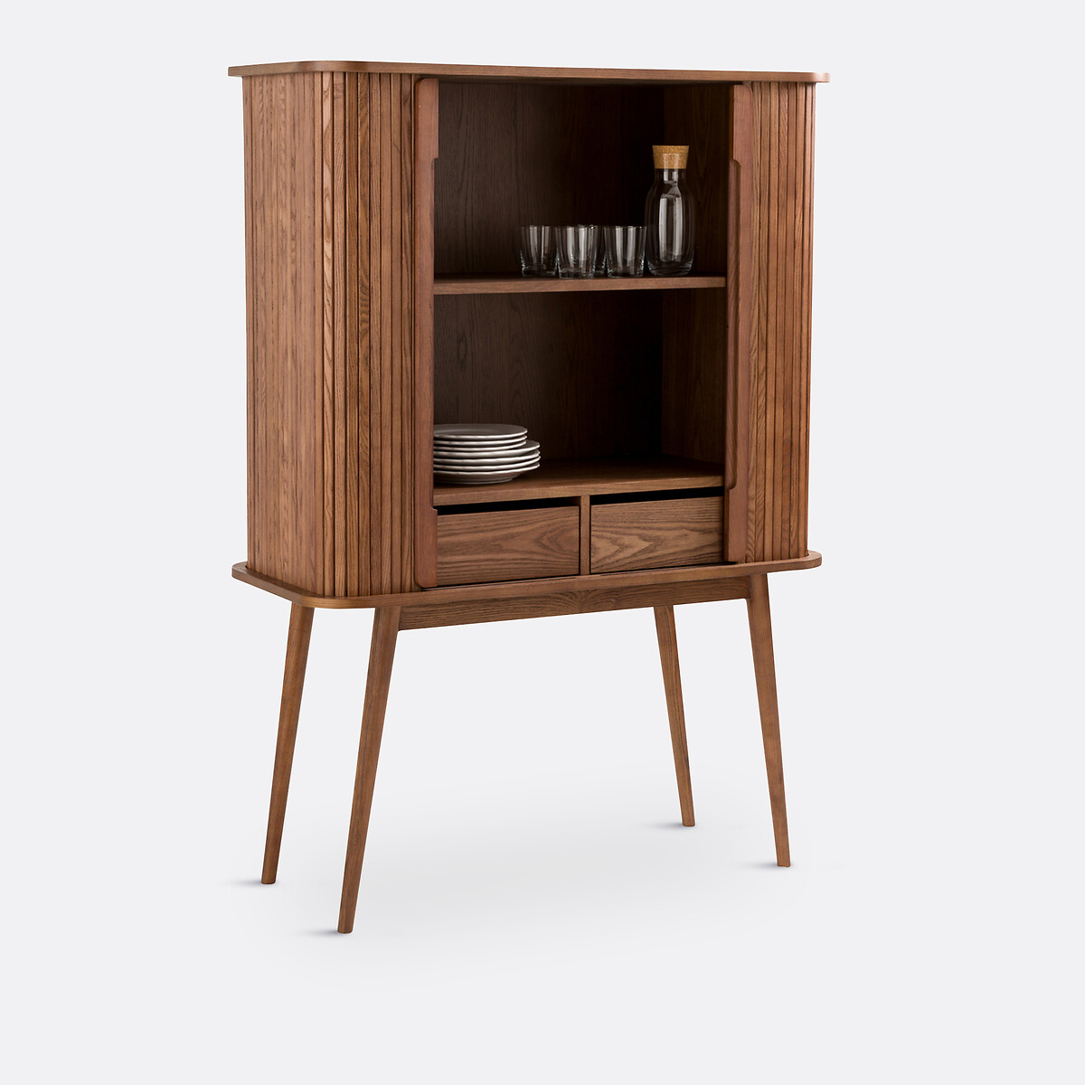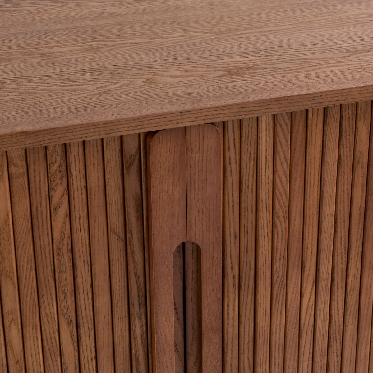 • 2 раздвижные дверки со шторками из массива ясеня с окраской под ореховое дерево, НЦ-лакировка