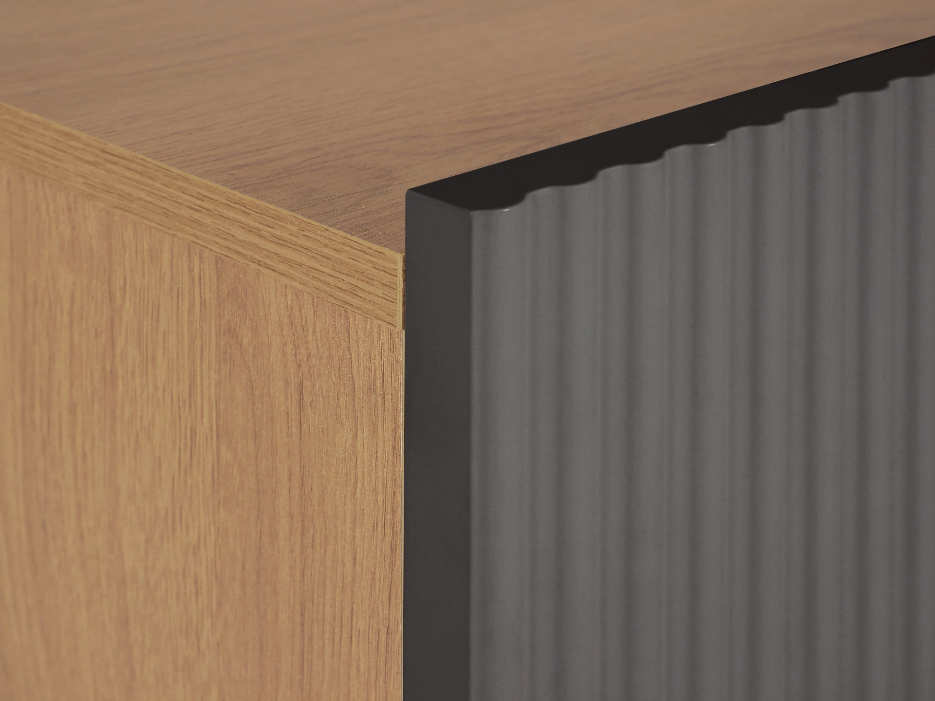 Запросить индивидуальное предложениеMira — коллекция выразительных сервантов, особенностью которых являются фактурные фасады с волнообразной обработкой нижнего края. Дизайн привлекает внимание. Рифлёная поверхность распашных дверей придаёт динамики и разнообразия.