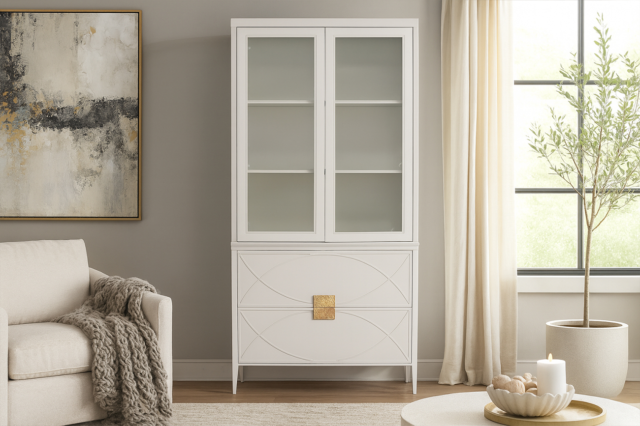 Запросить индивидуальное предложениеШкаф-витрина с двумя стеклянными фасадами и комодом — вертикальная композиция для гостиной или спальни, где каждая деталь работает на целостность. Прозрачные дверцы открывают вид на две полки внутри — достаточно места для книг, посуды или коллекций. Каждая деталь — от тонкого профиля рамы до золотистой вставки на ручке — продумана до миллиметра. Нижняя часть — комод с двумя ящиками, фасады которых украшены рельефной геометрией — добавляет акцент тихой роскоши. Ножки, слегка сужающиеся книзу, усиливают ощущение лёгкости. Дизайнерская мебель, созданная для тех, кто ценит порядок, красоту и тишину совершенной детали. Дизайнерский шкаф-витрина 2 стеклянных фасада с комодом с 2-мя ящиками в стиле ар-деко - авторская разработка студии Garda Decor. На фото представлена комплектация шкафа-витрины с 2-мя стеклянными фасадами(арт.151SV-000014) с комодом с 2-мя ящиками(арт.151SV-000012).
