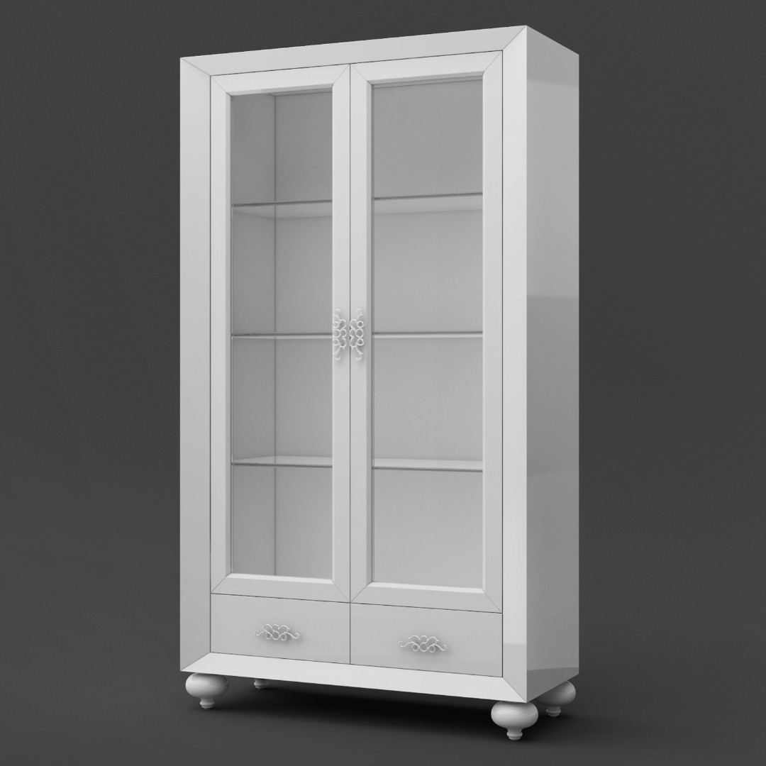 Витрина с 2 распашными стеклянными дверками выполнена в современном стиле. Отделка белый блестящий лак. Внутреннее наполнение 3 стеклянные полки и подсветка. Дополнена 2 выдвижными ящиками с системой плавного закрывания. Сделана из высококачественного МДФ высокой плотности и массива дерева. В производстве модели использовано закаленное стекло.